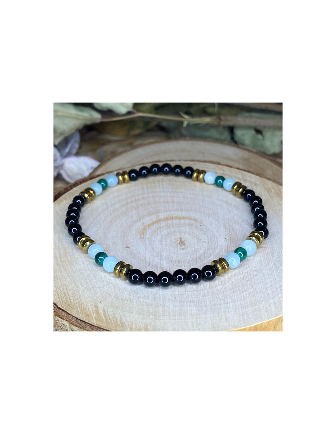 Le bracelet ethnique "Plénitude" combine l'Onyx, l'Hématite, l'Amazonite et la Malachite dans un design élégant avec des perles de 3à 4mm. Ce bracelet pour femme associe des pierres liées aux chakras racine, cœur et gorge. Il est conçu pour favoriser la sérénité et l'équilibre intérieur.